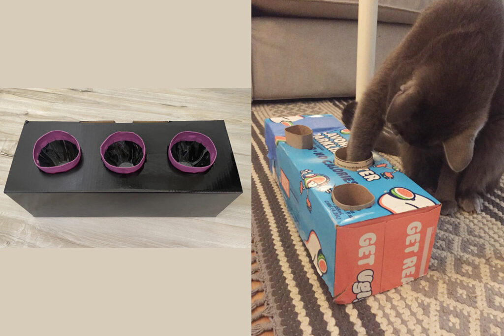 Dit voerspel maak je met een (schoenen)doos en drie WC-rollen. Trek de WC-rollen om op de bovenkant van de doos en knip het rondje uit. Niet te groot zodat de WC-rol er straks mooi strak in past. Schuif de WC-rollen in de ronde gaten, zodat ze mooi strak op de bodem staan. Stop wat brokjes in elk rolletje, en laat je kat lekker vissen!